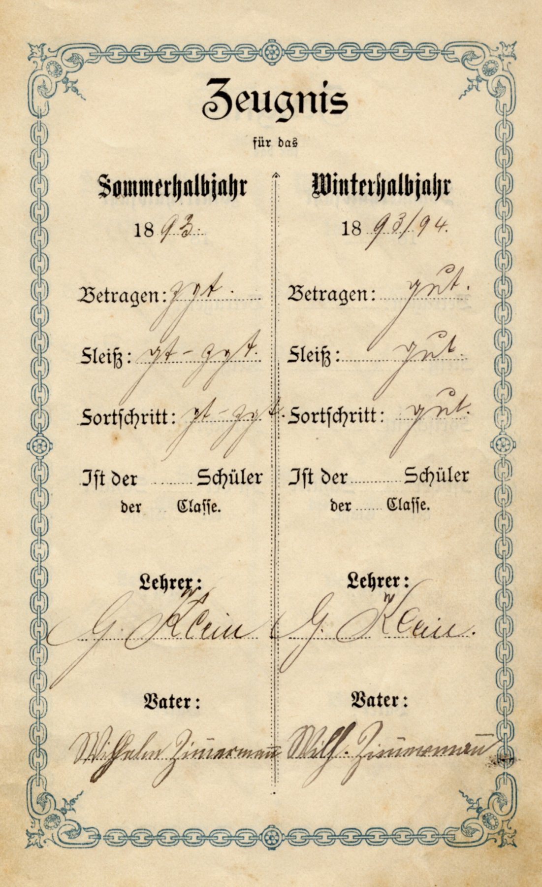 zeugnisbuchlein zeugnis fur 1893_94