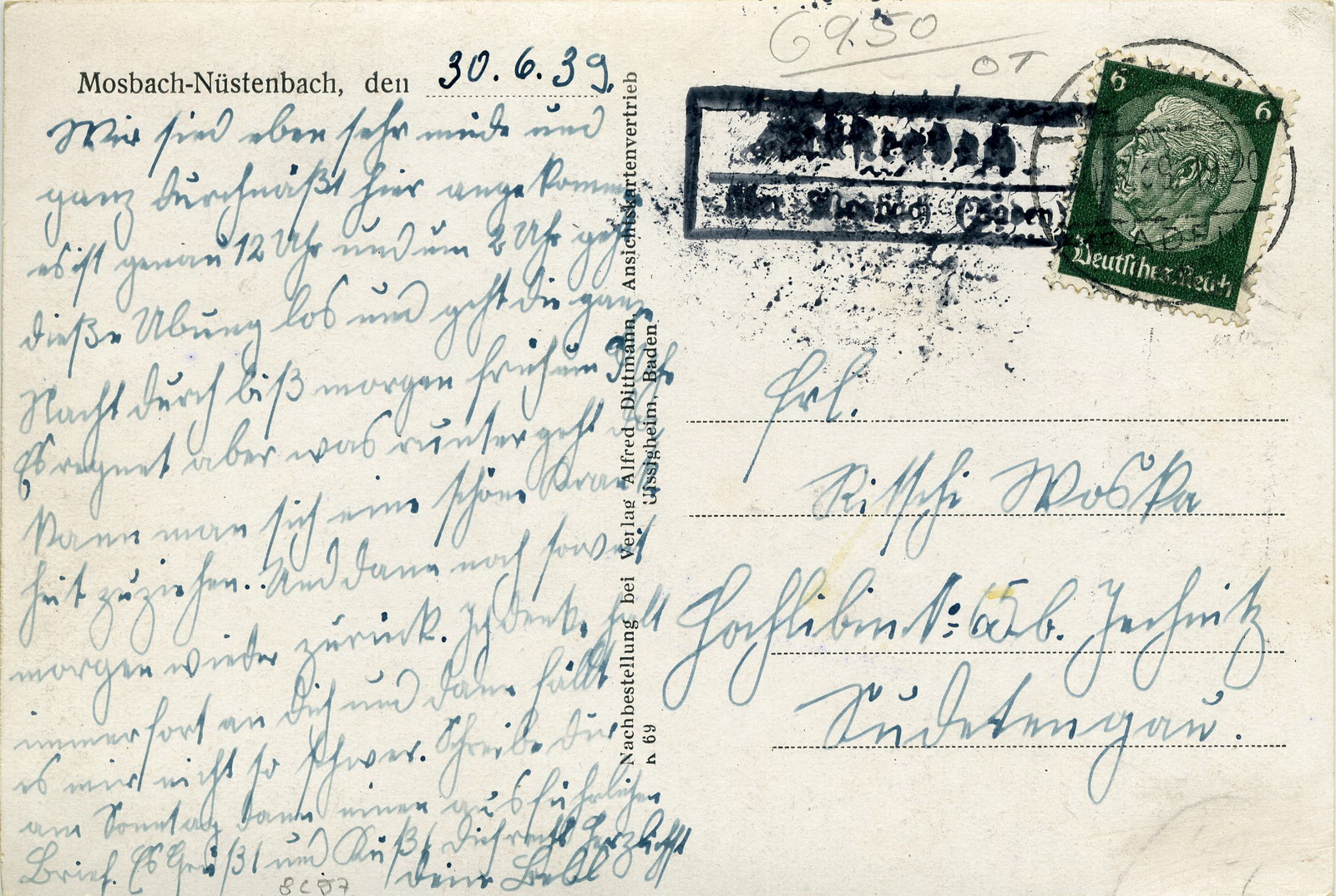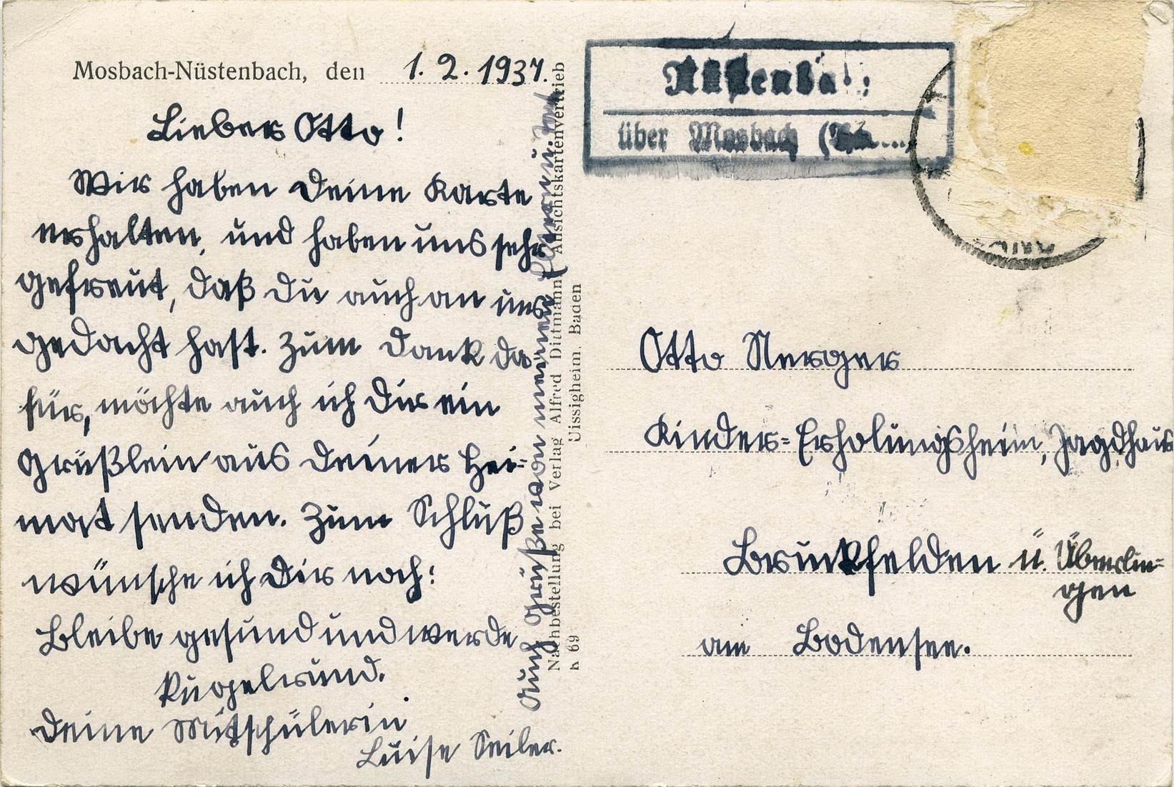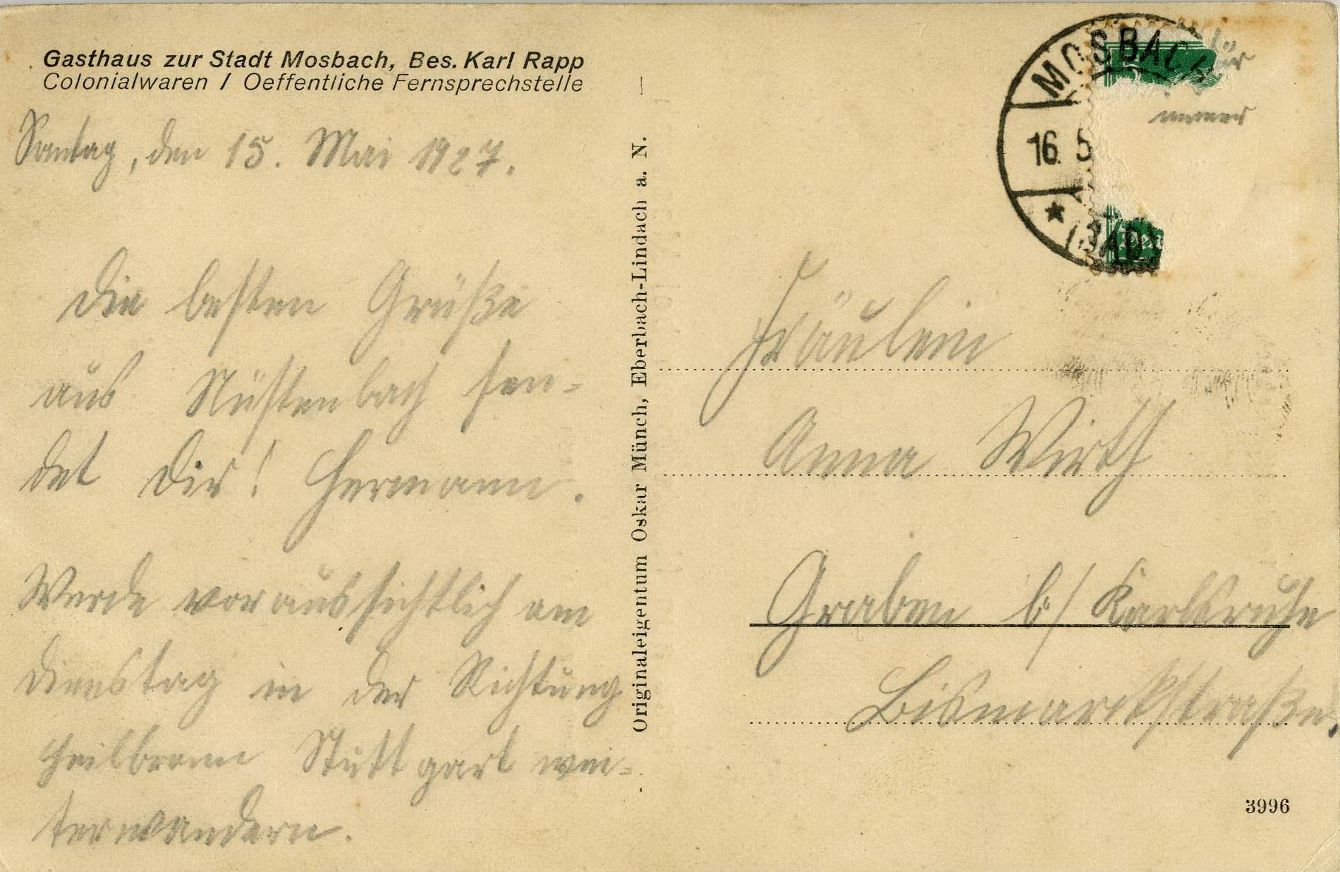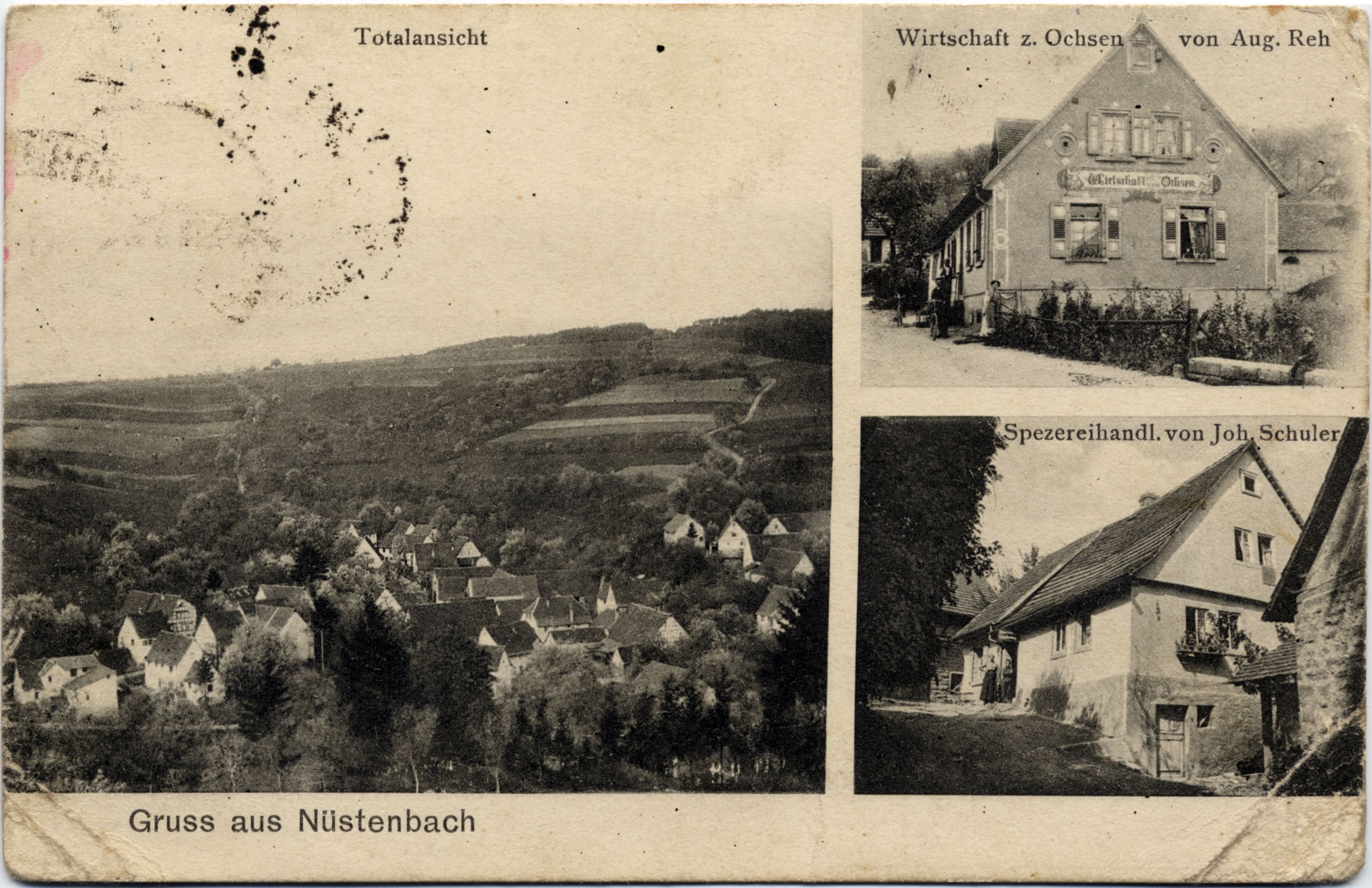 Aufdruck: Nüstenbach / Gasthaus zur Stadt Mosbach / Besitzer Julius Lauer