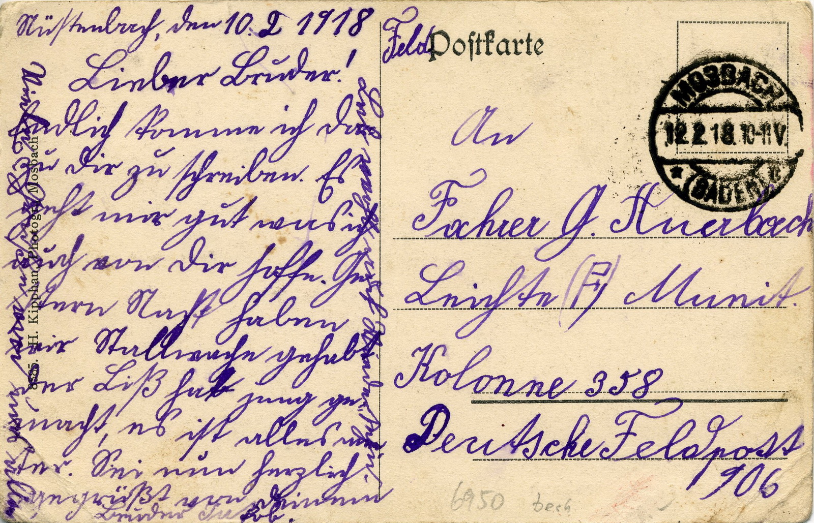 Lieber Bruder! Endlich komme ich dazu dir zu schreiben. Es geht mir gut was ich auch von Dir hoffe. Gestern Nacht haben wir Stallwache gehabt, der Liß hat jung gemacht, es ist alles munter. Sei nun herzlich gegrüßt von Deinem Bruder Jakob. Viele Grüße von uns allen. Leb wohl, auf Wiedersehen.