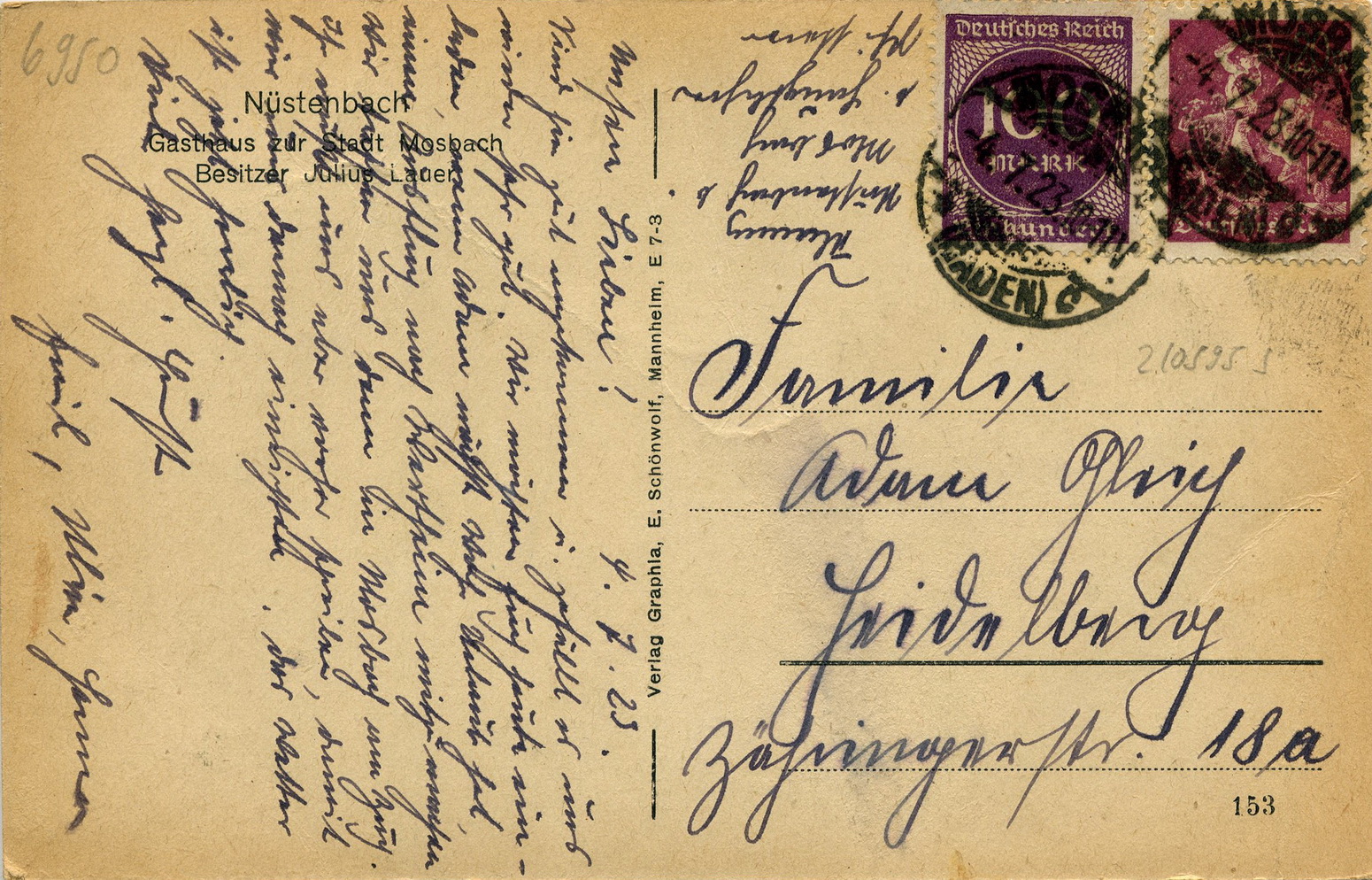 Mit inflationsbedingter Frankierung. Hinweis auf den damaligen Besitzer des Gasthauses zur Stadt Mosbach: Julius Lauer