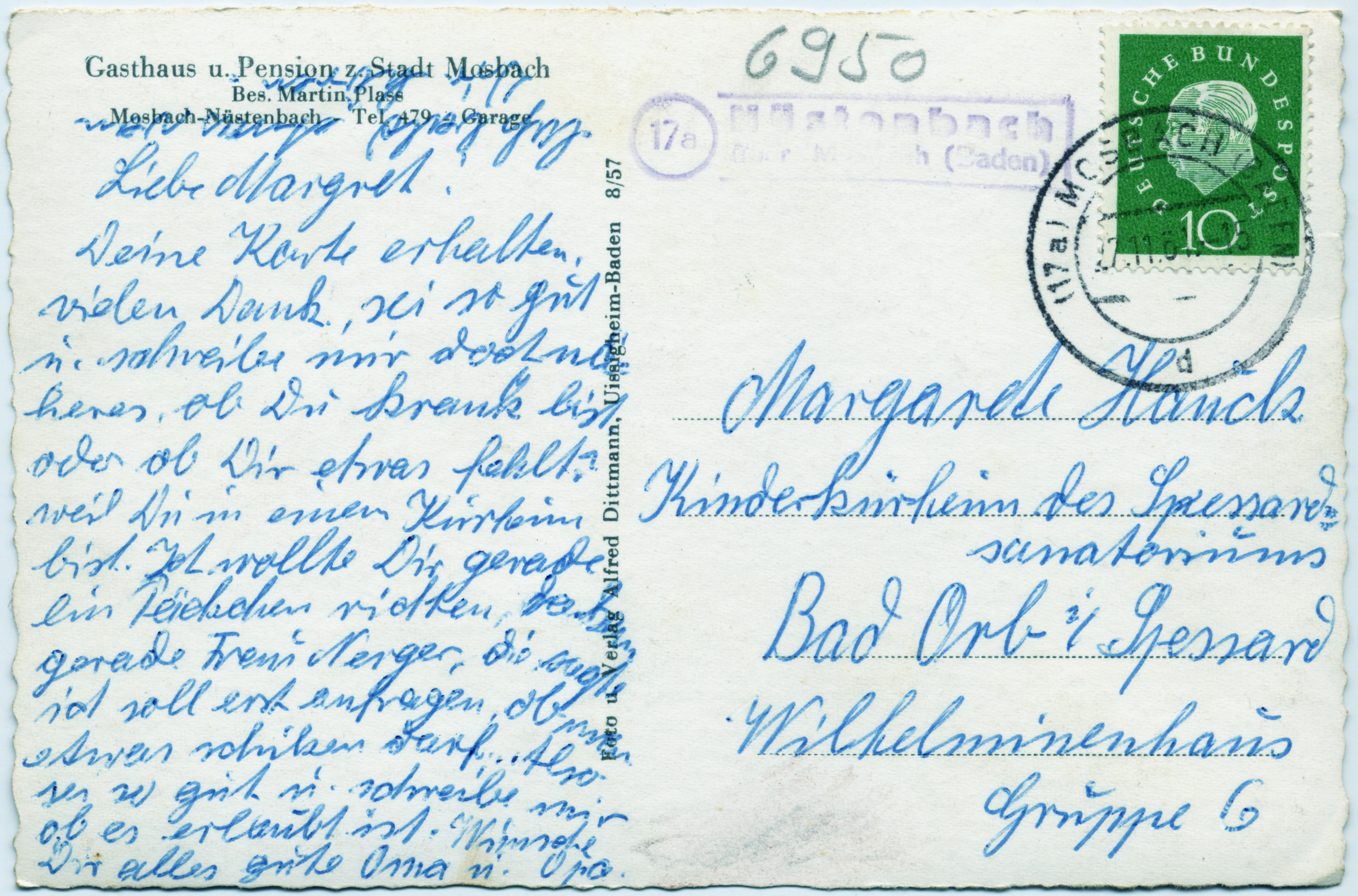 Lieber Otto! Wir haben Deine Karte erhalten und haben uns sehr gefreut, daß Du auch an uns gedacht hast. Zum Dank dafür, möchte ich Dir ein Grüßlein aus Deiner Heimat senden. Zum Schluß wünschen wir Dir noch: Bleibe gesund und werde kugelrund. Deine Mitschülerin Luise Seiler