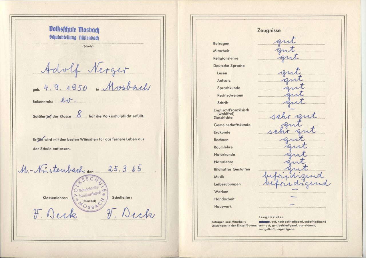 Abschlusszeugnis der Dorfschule 1965