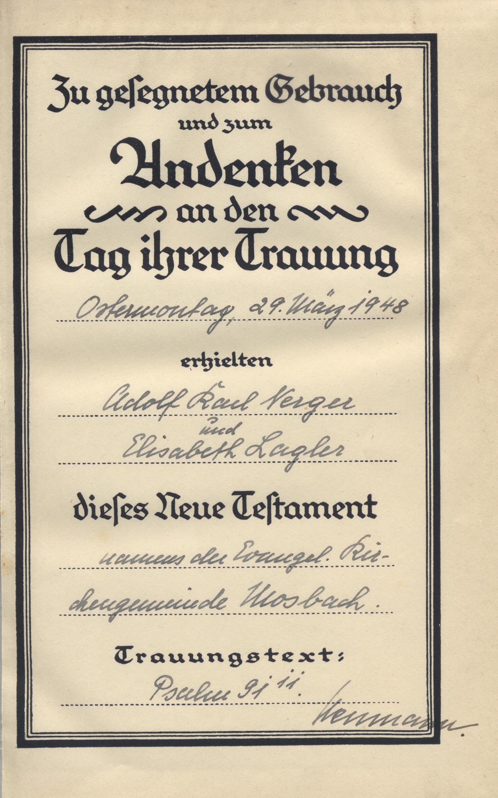 Widmung im Neuen Testament Adolf Nerger und Elisabeth Lagler